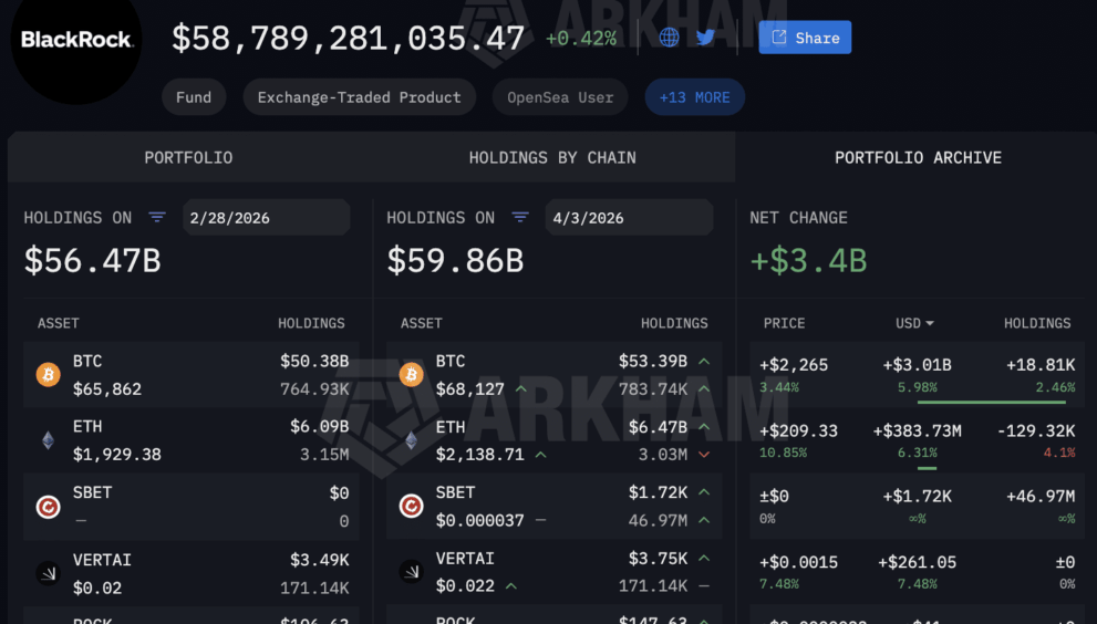 The BlackRock crypto fund currently holds approximately $53.39Bn in Bitcoin, according to the real-time wallet dashboard on Arkham Intelligence at the time of writing (April 3).