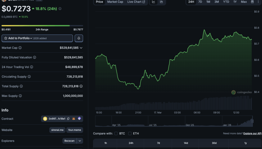 SIREN crypto has emerged as a standout performer in a choppy market, surging above the $0.70 level while major caps struggle for direction. The BSC-based token is currently trading over $0.72, posting a volatile 24-hour performance that has seen it top daily gainer lists.