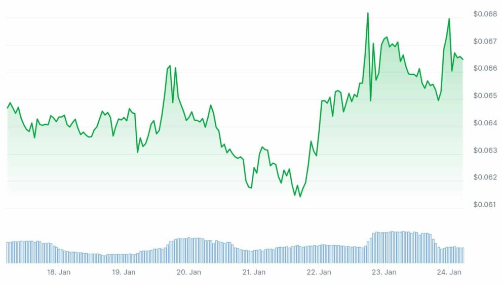 Volume has picked up during the rebound. A possible neckline sits around $0.0778. A clean break above that level could signal a broader trend shift.