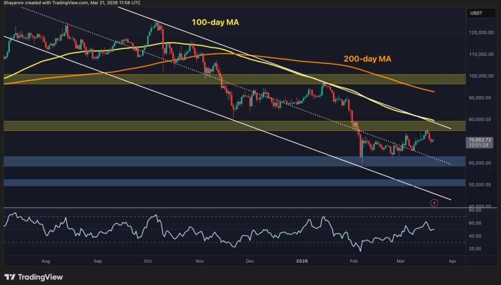 Bitcoin is still in recovery mode, but the pace has cooled as the price runs into a heavier resistance cluster in the low-to-mid $70,000s. The market has already bounced meaningfully from the February washout near $60,000, yet the latest price action shows that buyers are now being forced to prove they can do more than just rebound. So, this no longer seems like a simple relief rally zone, but an area where the structure needs follow-through.
